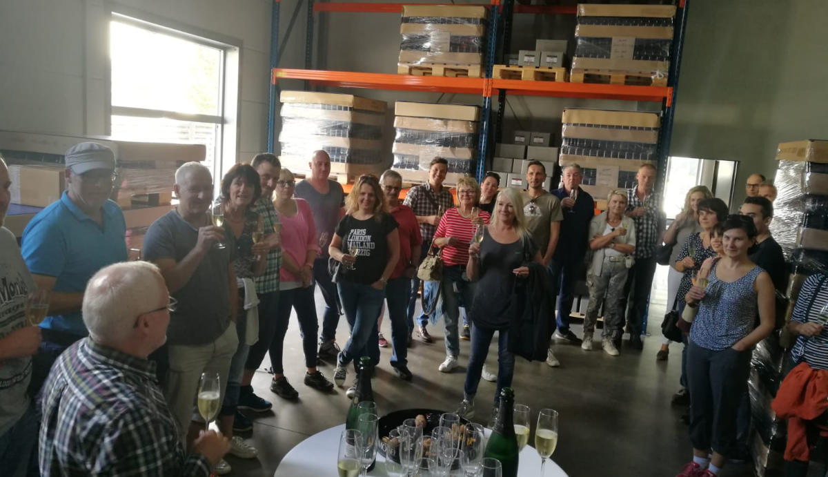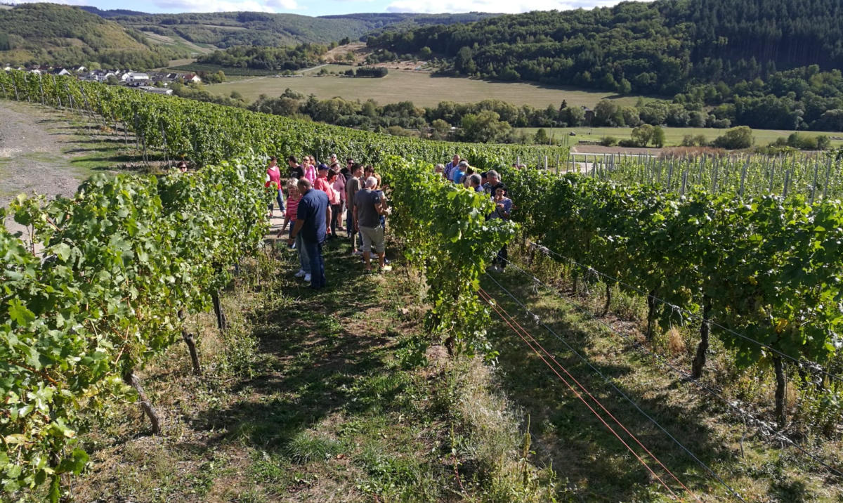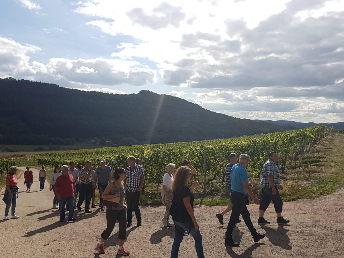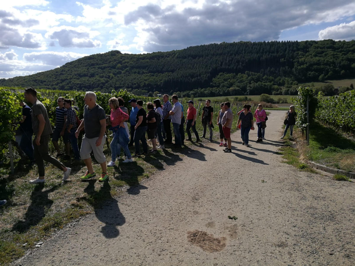 Am 15. September war es wieder soweit… Wir fuhren zu unseren Freunden nach Oberemmel zum Weingut Kirchen-Faber. Mit der Rekordteilnehmerzahl von 38 Personen starteten wir um 13:00 Uhr Richtung Weingut. Diesmal wurden bereits im Bus gekühlte Getränke serviert (wir sind ja lernfähig), welches die Anreise gleich viel kurzweiliger gestaltete. Im Weingut wurden wir dann mit einem Sekt Willkommen geheißen. Im Anschluss an die kleine Erfrischung wurde uns die Arbeitsweise des neuen Vollernters erklärt und gezeigt. Dann ging es zu einer geführten Runde in den Wingert. Hier wurde uns mal wieder allerlei Wissenswertes über den Wein und die Lese vermittelt. Mit geballtem Wissen kehrten wir nun zurück zum Weingut und konnten hier unser Gelerntes im praktischen Teil stimmungsvoll umsetzen. Eine Flasche nach der anderen wurde auf den Prüfstand gestellt und für gut befunden. Auch gab es gut geschwenktes Schaukelfleisch und selbstgemachte Salate (Dank an die Spender), die mit Appetit verspeist wurden.Im Anschluß verbrachten wir noch ein paar schöne Stunden in der Weinstube, bis uns der Bus letztlich gegen 22:30 Uhr wieder wohlbehalten nach Hause brachte.